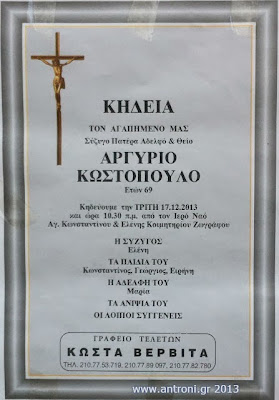 Έφυγε το ξημέρωμα της Κυριακής 15. 12. 2013 ένας αγαπητός φίλος και καλός συμπατριώτης από τη Σπαρτουλιά, ο Αργύρης Κωστόπουλος που γεννήθηκε πριν 69 χρόνια.